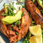 Cut open sweet potatoes, and spoon in the sauce! Garnish with your favorite toppings- I used sliced avocados, chives, and parve sour cream, and served a salad alongside it.